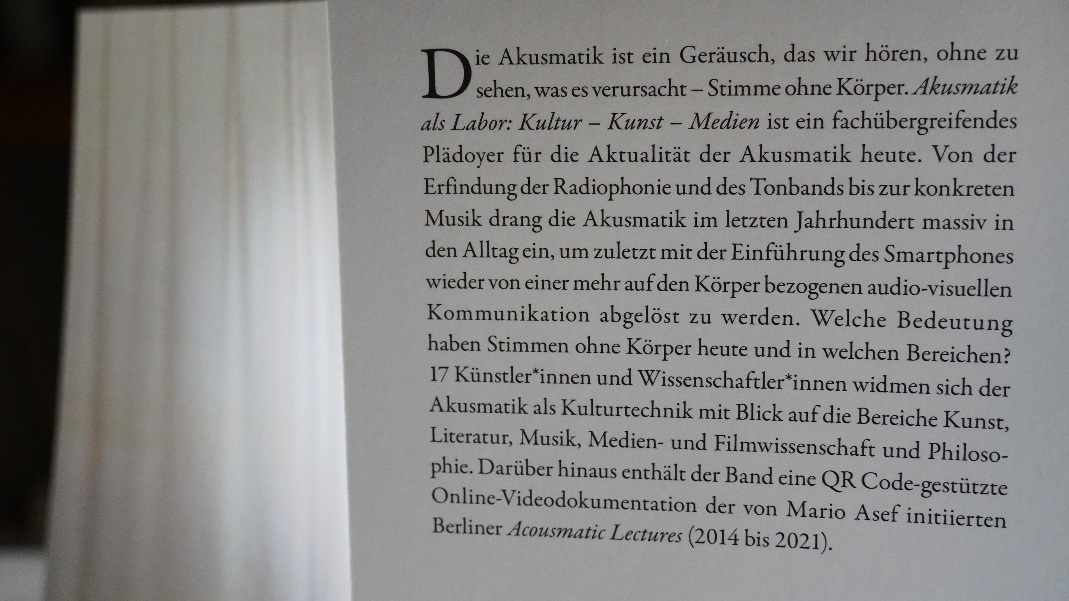 Acousmatics is sound that we hear without seeing what causes it – voice without body. Akusmatik als Labor: Kultur – Kunst – Medien is a multidisciplinary plea for the relevance of acousmatics today. From the invention of radiophony and tape to concrete music, acousmatics massively penetrated everyday life in the last century, only to be replaced again by more body-based audio-visual communication, most recently with the introduction of the smartphone. What is the significance of voices without bodies today, and in which areas? 17 artists and scholars address acousmatics as a cultural technique with a view to the fields of art, literature, music, media and film studies, and philosophy. In addition, the volume contains QR code-supported online video documentation of the Berlin Acousmatic Lectures (2014 to 2021) initiated by Mario Asef.